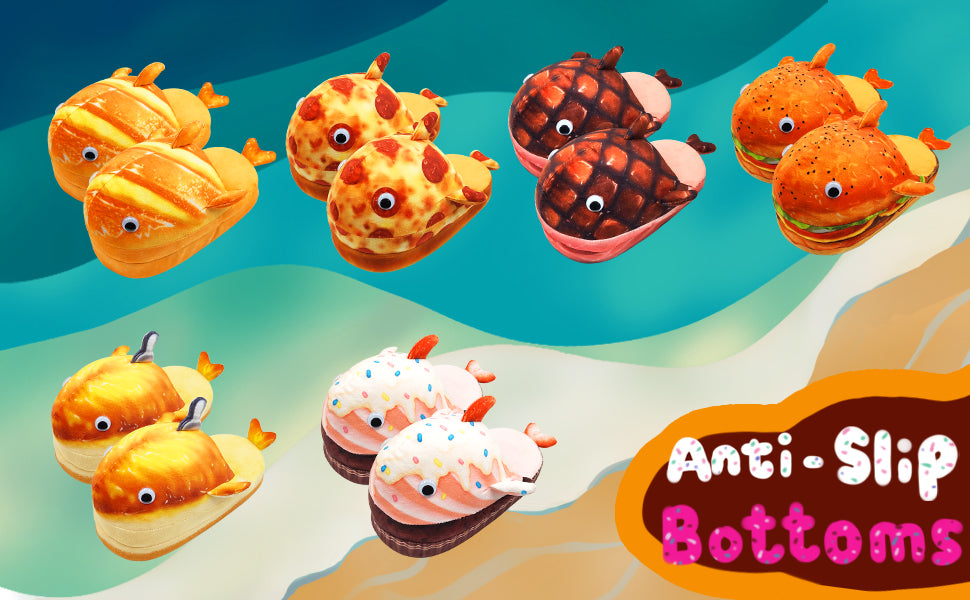 Whale slippers perfectly combine a variety of delicious foods and design Whale cheesecake slippers, Whale bread slippers, Whale pizza slippers, Whale hamburger slippers, Whale steak slippers, Whale strawberry Cake slippers. Will wearing whale slippers increase your appetite? If you love these foods, these slippers are perfect for you!